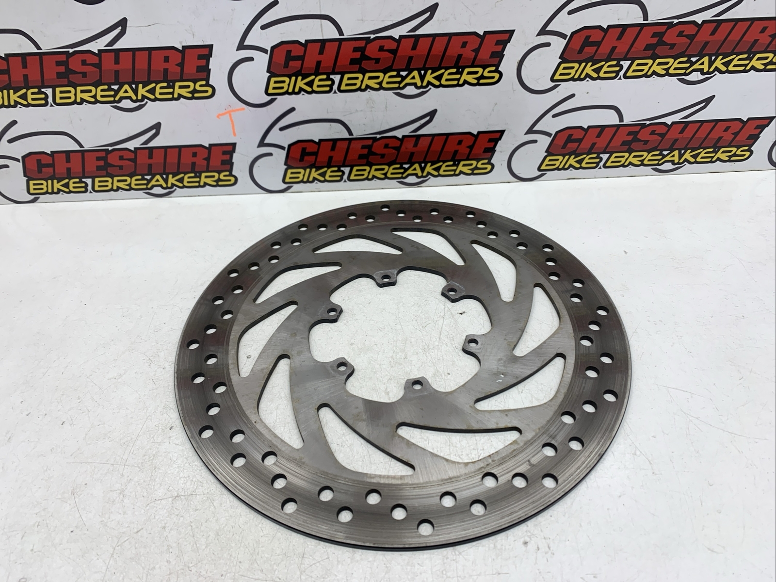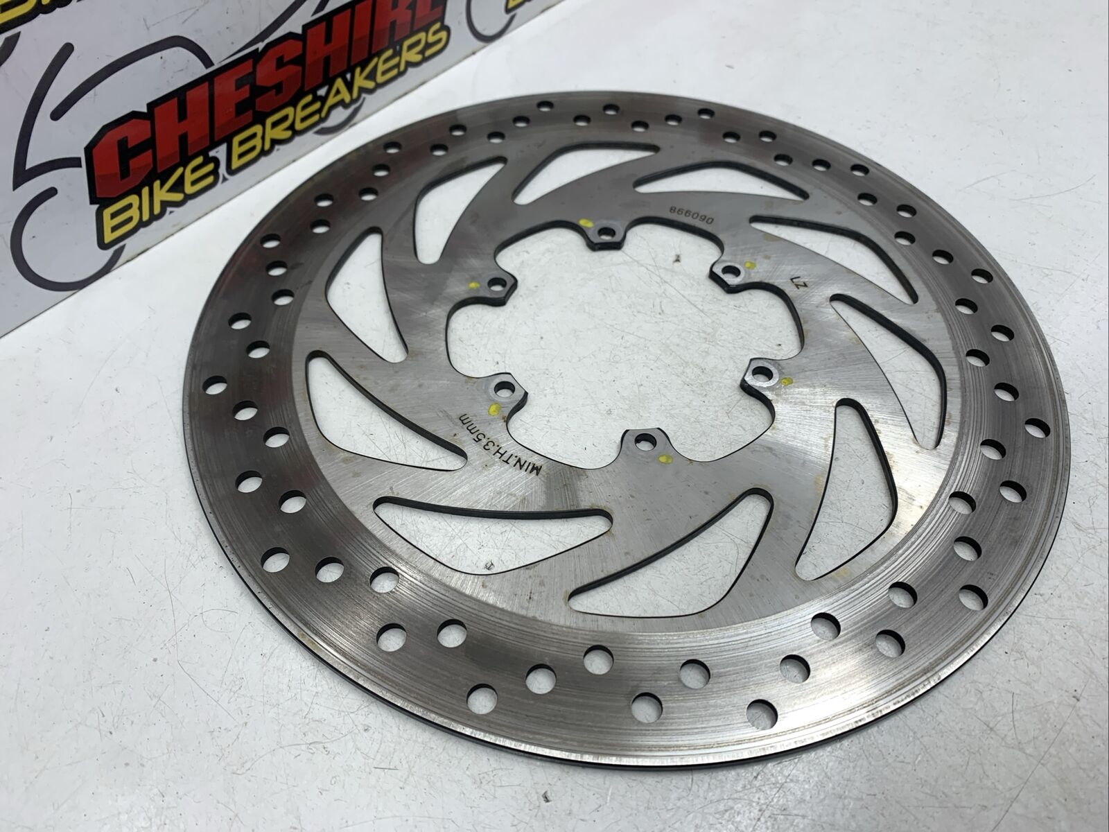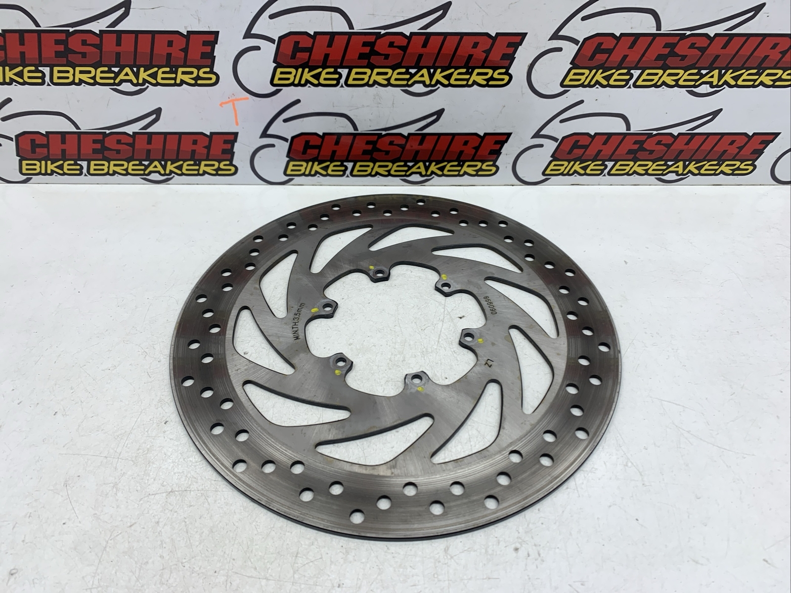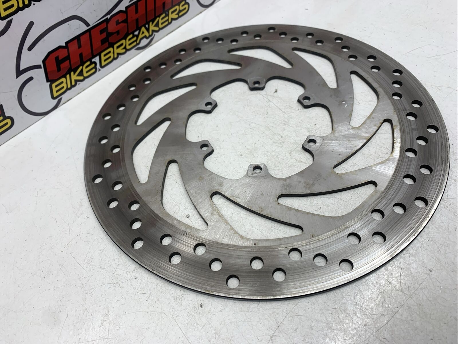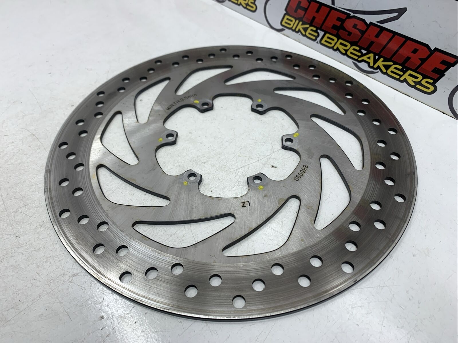 Front brake disc. Disc has 4mm thickness. Some light marks maybe present, please see pictures for more of a detailed view. Removed from a 2023 motorcycle. This item comes with a 60 day warranty included.