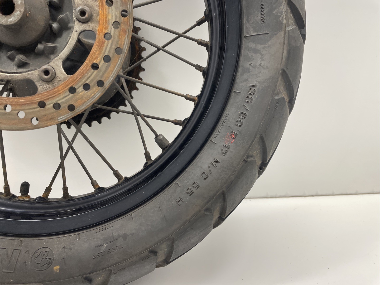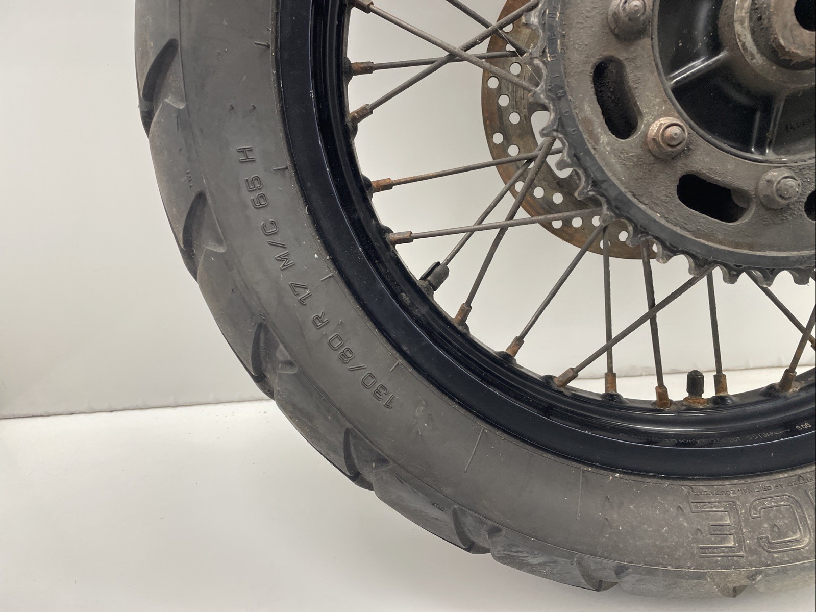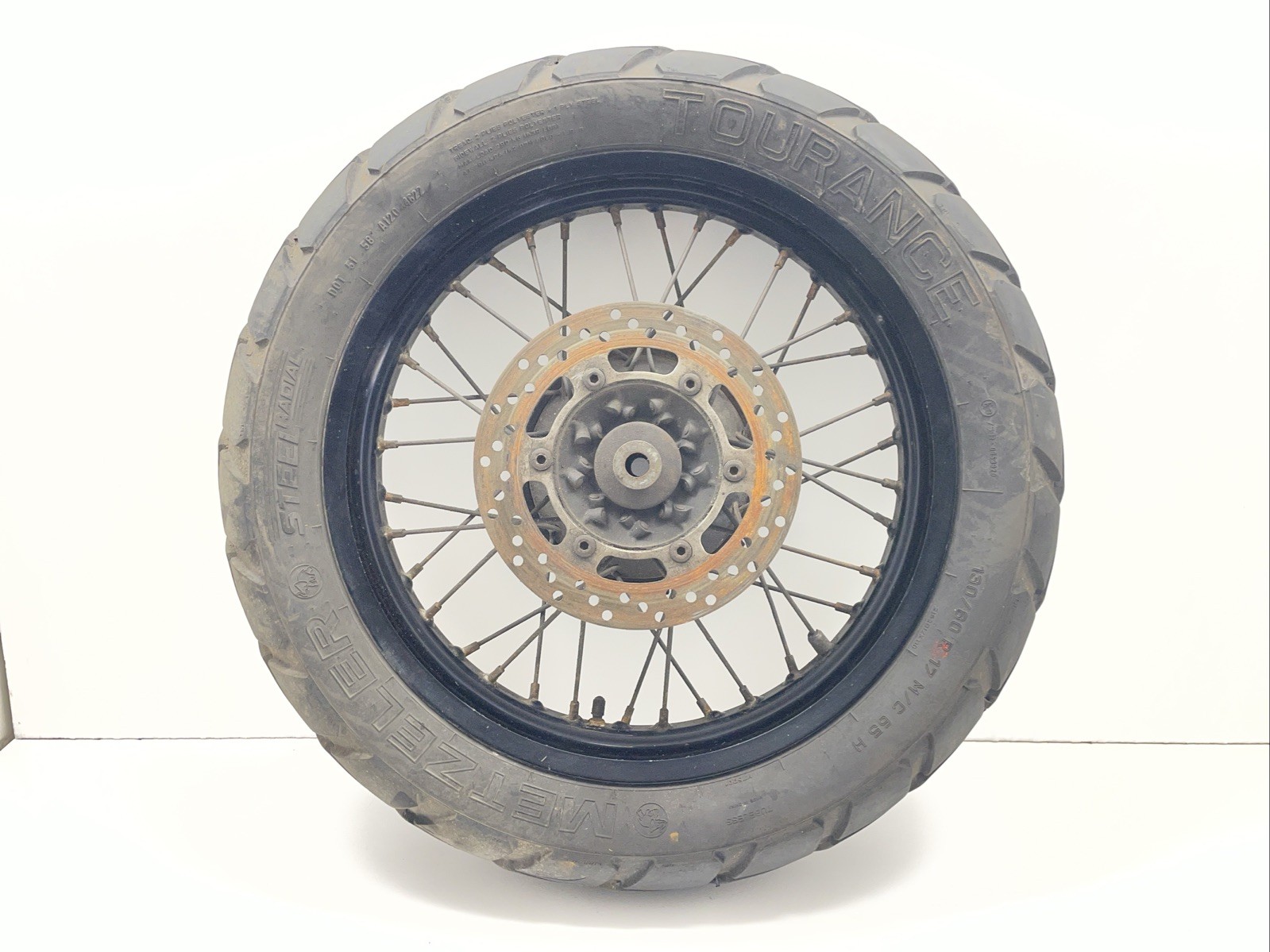 Rear wheel. Disc & tyre will need replacing. Some minor cosmetic marks may be present (see photos for details)